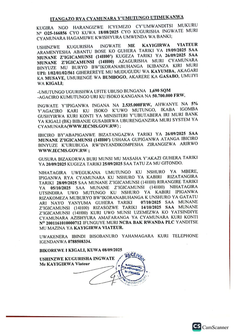 CyamunaraImitungo Itimukanwa Gasabo-Bumbogo: Cyamunara y’ikibanza Yanditswe 08/09/2025 Share SHARE Tanga igitekerezo Leave a Reply Cancel replyYour email address will not be published. Required fields are marked *Comment * Name * Email * Website Save my name, email, and website in this browser for the next time I comment. Kwamamaza Kwamamaza Kwamamaza