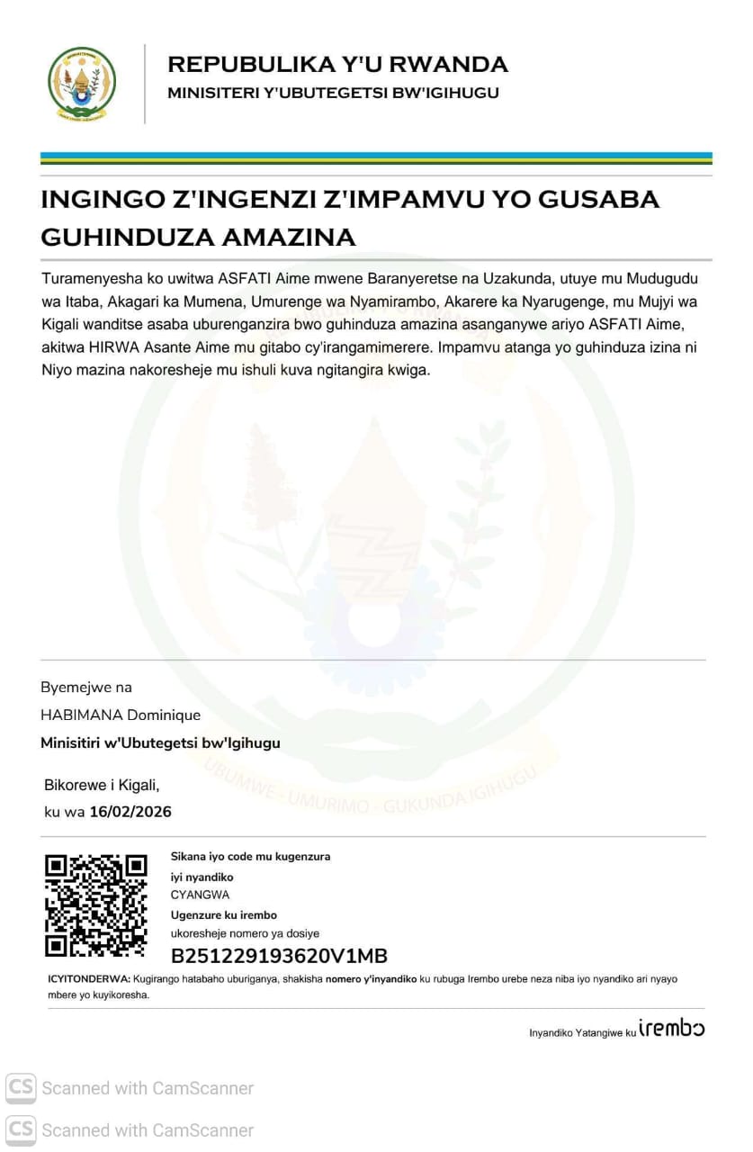 AmatangazoGuhindura Izina Guhindura amazina asanganywe ariyo ASFATI Aimé akitwa HIRWA Asante Aimé mu gitabo cy’irangamimerere Yanditswe 27/02/2026 Share SHARE Tanga igitekerezo Leave a Reply Cancel replyYour email address will not be published. Required fields are marked *Comment * Name * Email * Website Save my name, email, and website in this browser for the next time I comment. Kwamamaza Kwamamaza Kwamamaza
