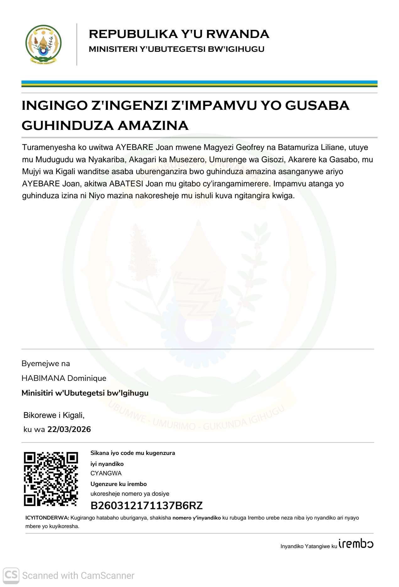 AmatangazoGuhindura Izina Guhindura amazina asanganywe ariyo AYEBARE Joan akitwa ABATESI Joan mu gitabo cy’irangamimerere Yanditswe 02/04/2026 Share SHARE Tanga igitekerezo Leave a Reply Cancel replyYour email address will not be published. Required fields are marked *Comment * Name * Email * Website Save my name, email, and website in this browser for the next time I comment. Kwamamaza Kwamamaza Kwamamaza