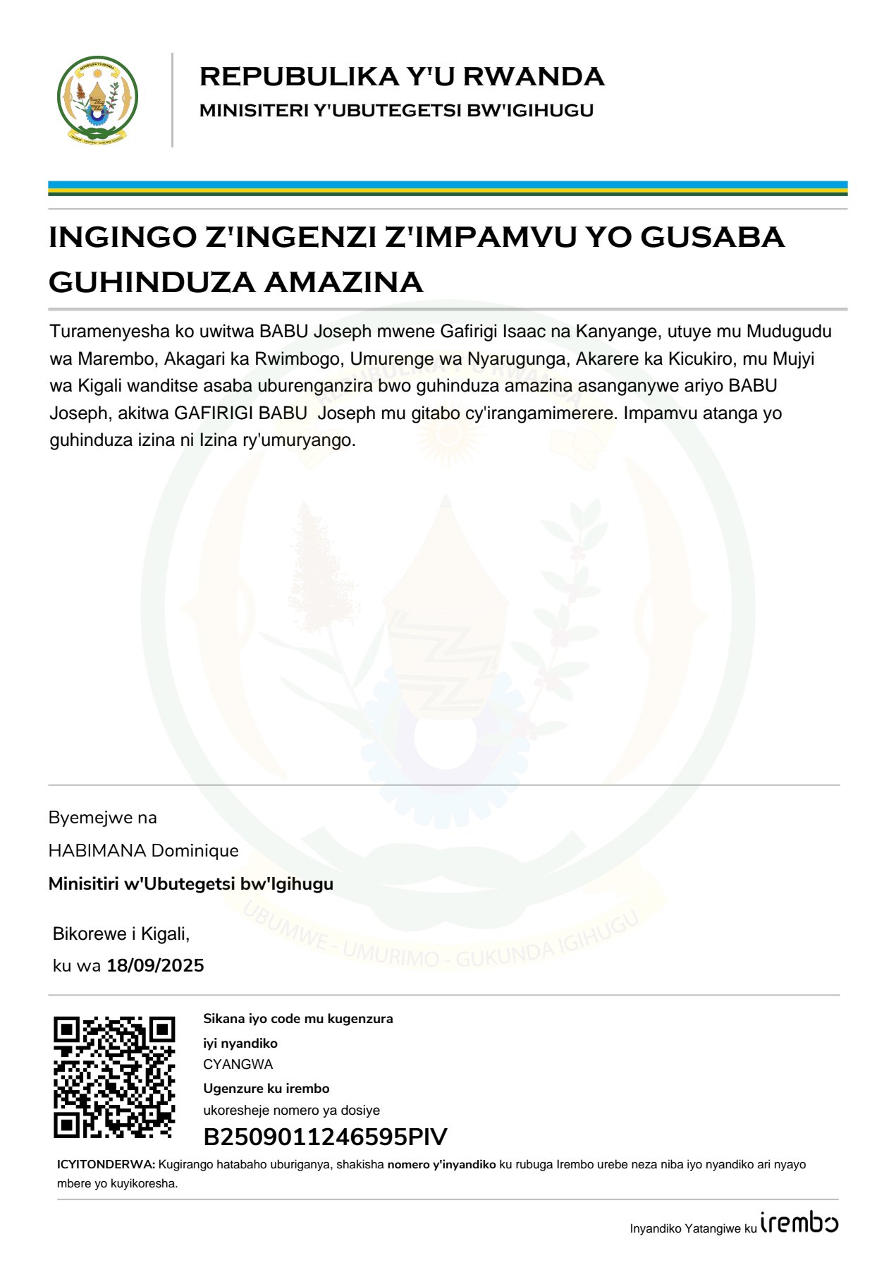 AmatangazoGuhindura Izina Guhindura amazina asanganywe ariyo BABU Joseph akitwa GAFIRIGI BABU Joseph mu gitabo cy’irangamimerere Yanditswe 05/01/2026 Share SHARE Tanga igitekerezo Leave a Reply Cancel replyYour email address will not be published. Required fields are marked *Comment * Name * Email * Website Save my name, email, and website in this browser for the next time I comment. Kwamamaza Kwamamaza Kwamamaza