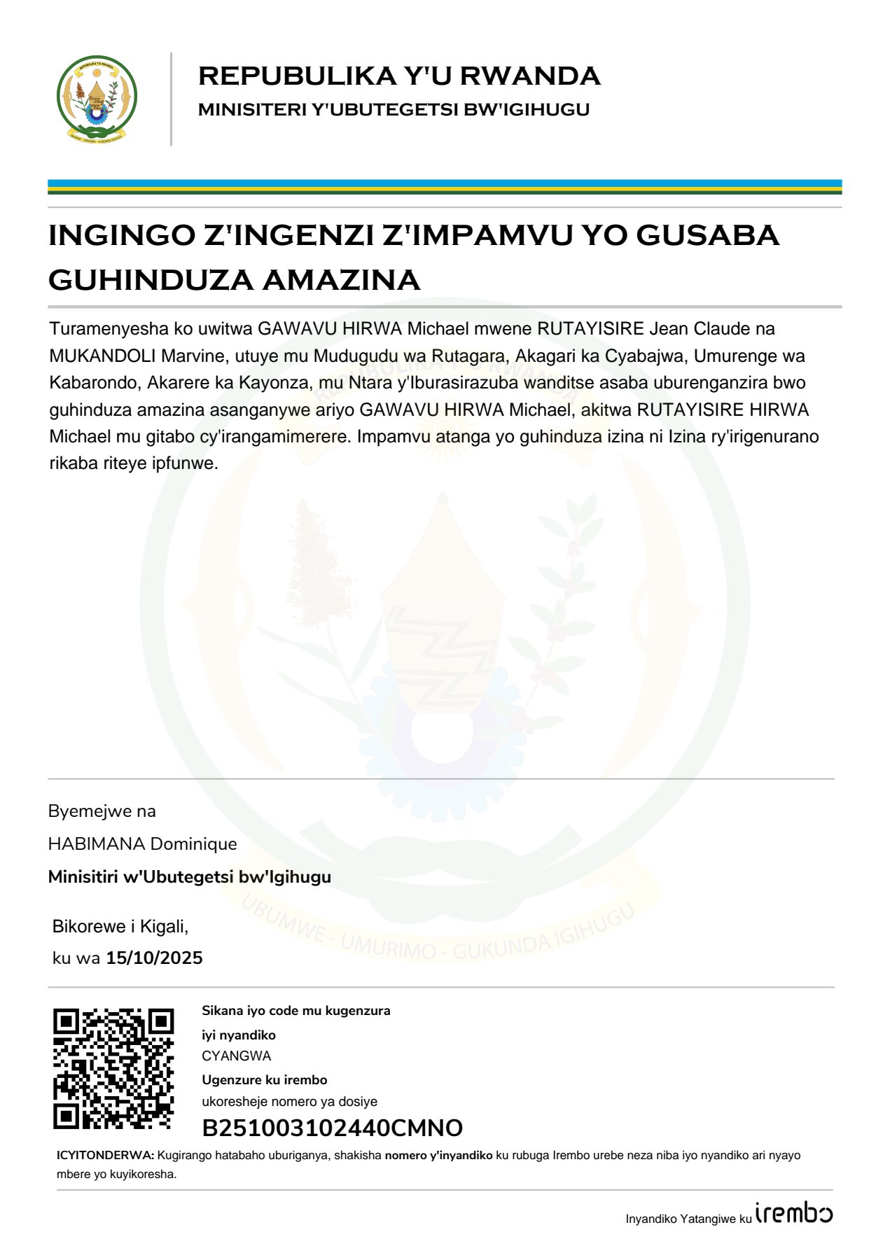 AmatangazoGuhindura Izina Guhindura amazina asanganywe ariyo Gawavu Hirwa Michael akitwa Rutayisire Hirwa Michael mu gitabo cy’irangamimerere Yanditswe 22/12/2025 Share SHARE Tanga igitekerezo Leave a Reply Cancel replyYour email address will not be published. Required fields are marked *Comment * Name * Email * Website Save my name, email, and website in this browser for the next time I comment. Kwamamaza Kwamamaza Kwamamaza