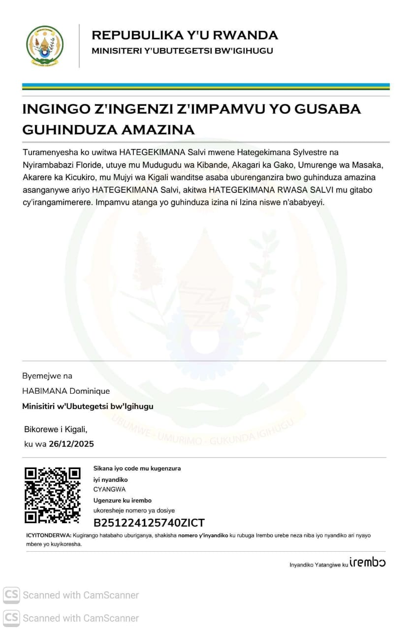 AmatangazoGuhindura Izina Guhindura amazina asanganywe ariyo Hategekimana SALVI akitwa Hategekimana RWASA SALVI mu gitabo cy’irangamimerere Yanditswe 26/02/2026 Share SHARE Tanga igitekerezo Leave a Reply Cancel replyYour email address will not be published. Required fields are marked *Comment * Name * Email * Website Save my name, email, and website in this browser for the next time I comment. Kwamamaza Kwamamaza Kwamamaza
