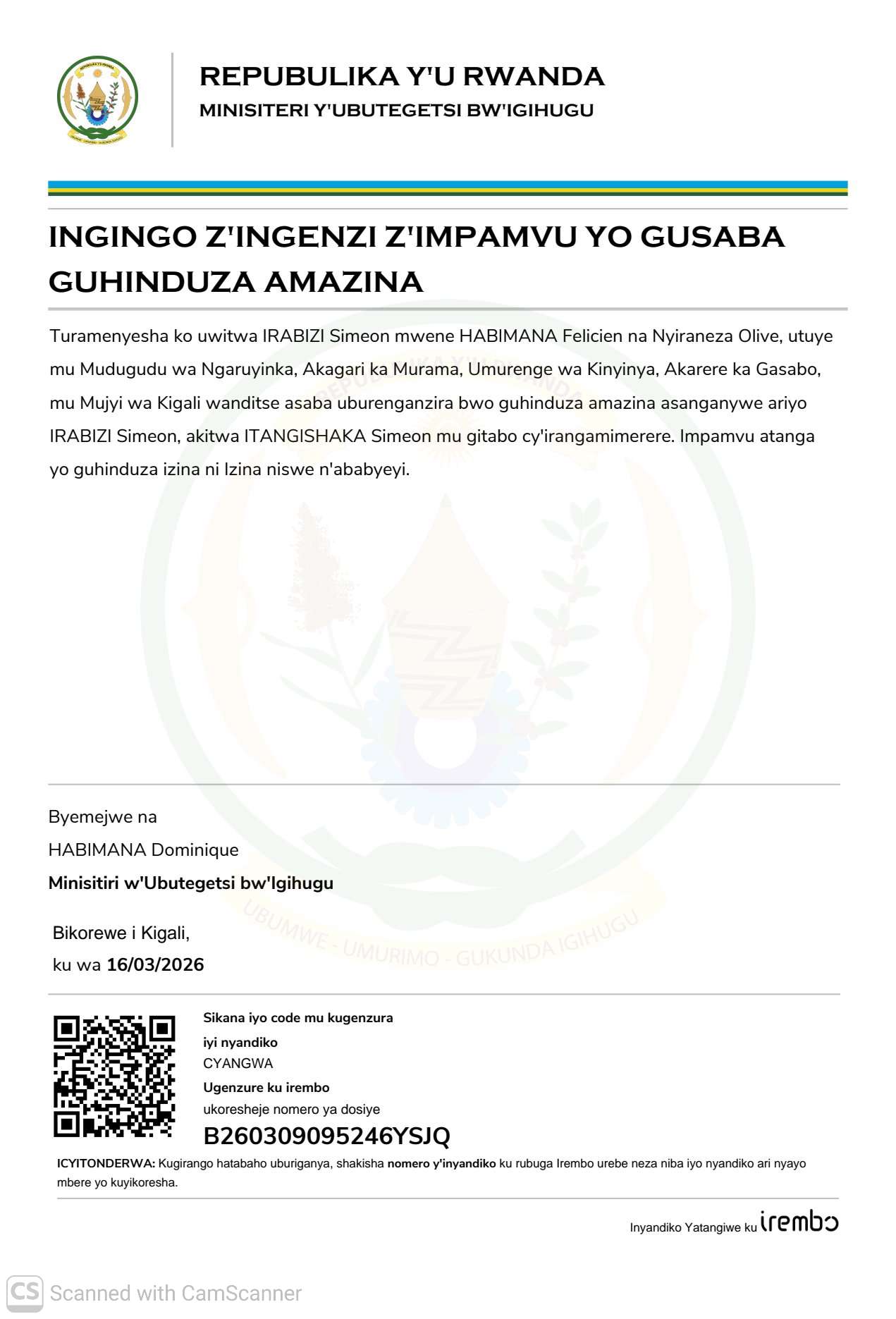 AmatangazoGuhindura Izina Guhindura amazina asanganywe ariyo IRABIZI Simeon akitwa ITANGISHAKA Simeon mu gitabo cy’irangamimerere Yanditswe 14/04/2026 Share SHARE Tanga igitekerezo Leave a Reply Cancel replyYour email address will not be published. Required fields are marked *Comment * Name * Email * Website Save my name, email, and website in this browser for the next time I comment. Kwamamaza Kwamamaza Kwamamaza