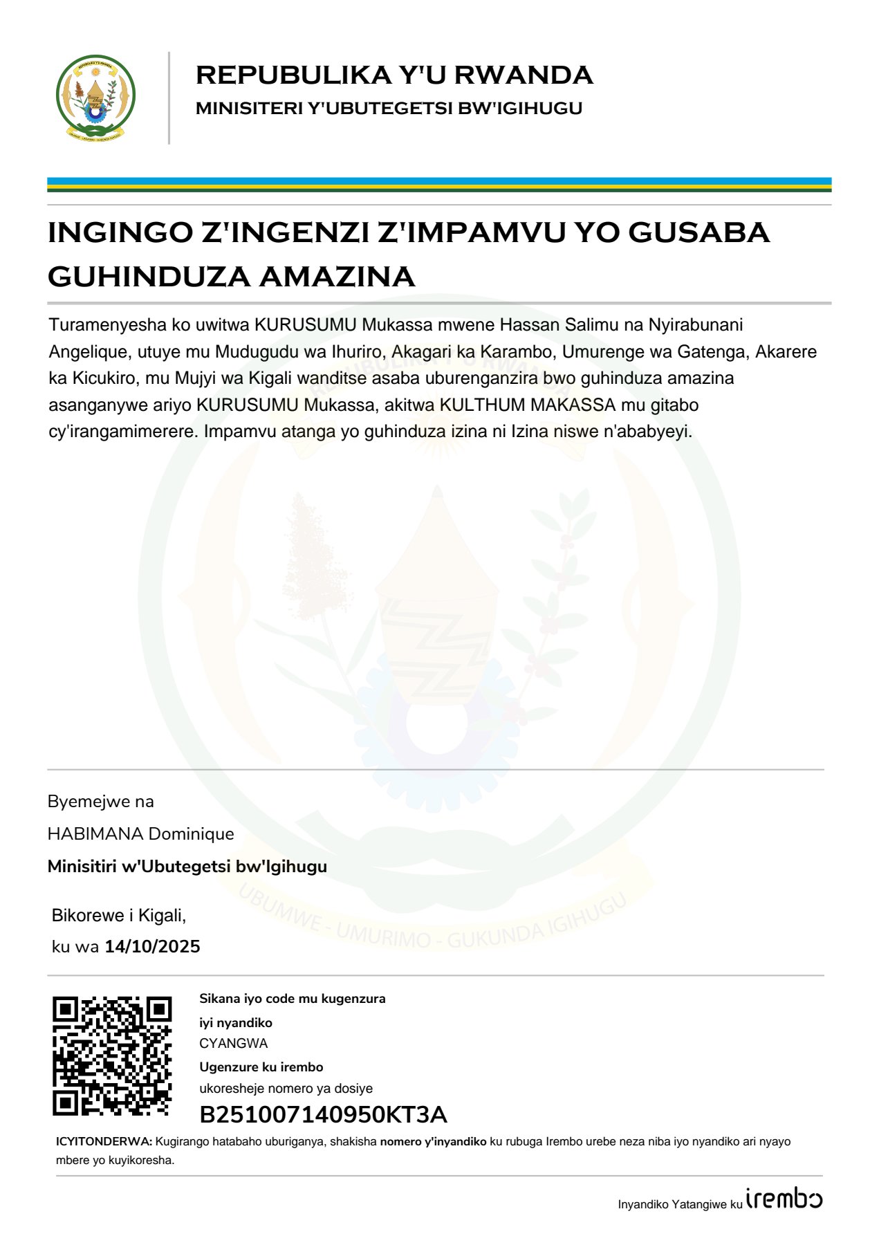 AmatangazoGuhindura Izina Guhindura amazina asanganywe ariyo Kurusumu Mukassa akitwa Kulthum Makassa mu gitabo cy’irangamimerere Yanditswe 17/11/2025 Share SHARE Guhindura amazina asanganywe ariyo Kurusumu Mukassa akitwa Kulthum Mukassa mu gitabo cy’irangamimerere Tanga igitekerezo Leave a Reply Cancel replyYour email address will not be published. Required fields are marked *Comment * Name * Email * Website Save my name, email, and website in this browser for the next time I comment. Kwamamaza Kwamamaza Kwamamaza