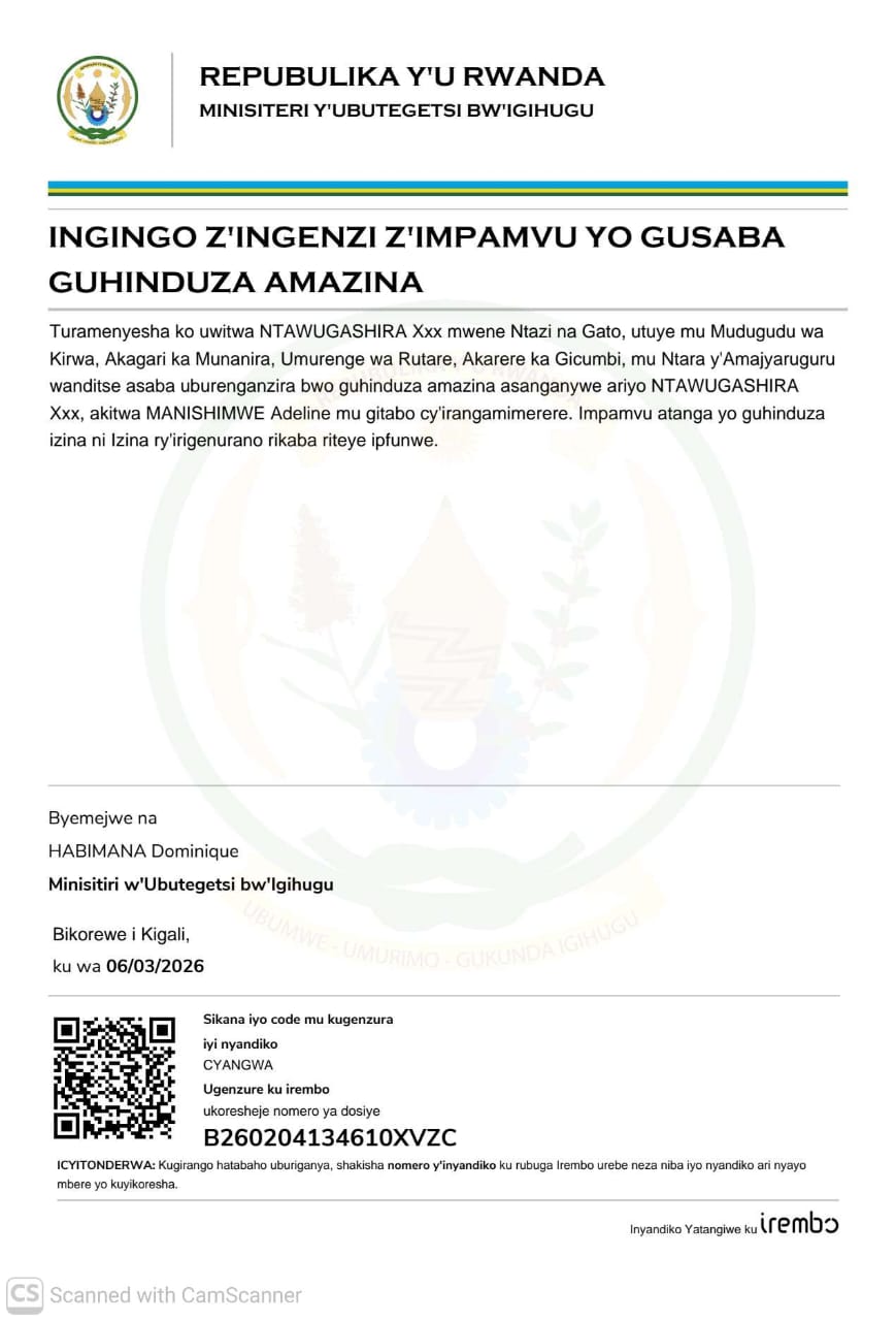 AmatangazoGuhindura Izina Guhindura amazina asanganywe ariyo NTAWUGASHIRA Xxx akitwa MANISHIMWE Adeline mu gitabo cy’irangamimerere Yanditswe 12/03/2026 Share SHARE Tanga igitekerezo Leave a Reply Cancel replyYour email address will not be published. Required fields are marked *Comment * Name * Email * Website Save my name, email, and website in this browser for the next time I comment. Kwamamaza Kwamamaza Kwamamaza