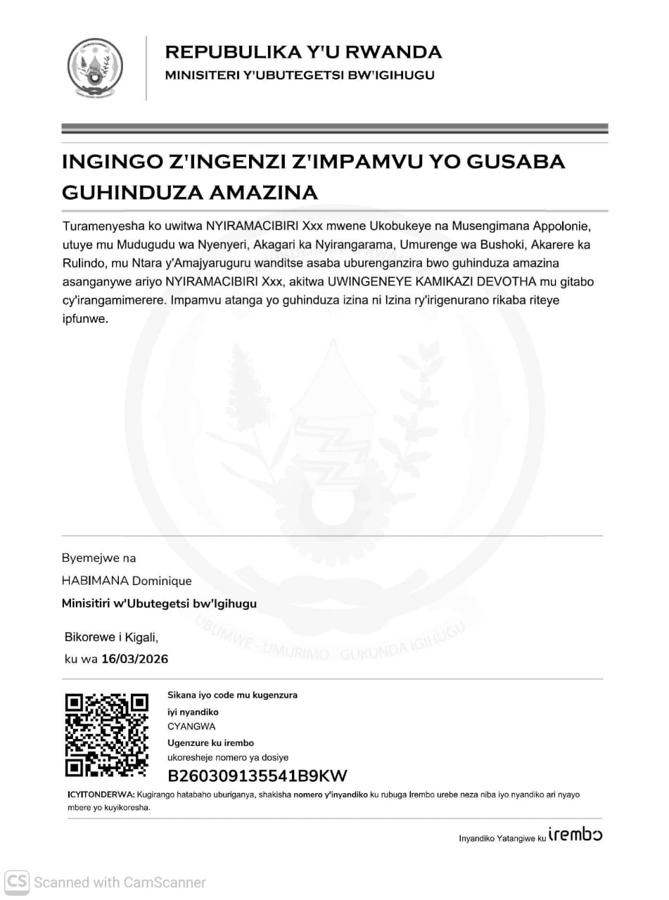 Guhindura amazina asanganywe ariyo NYIRAMACIBIRI Xxx akitwa UWINGENEYE KAMIKAZI Devotha mu gitabo cy’irangamimerere