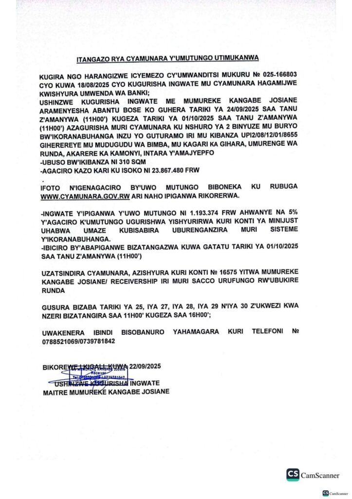 CyamunaraImitungo Itimukanwa Itangazo rya cyamunara y’inzu yo guturamo iherereye Kamonyi/Runda/Gihara Yanditswe 23/09/2025 Share SHARE Tanga igitekerezo Leave a Reply Cancel replyYour email address will not be published. Required fields are marked *Comment * Name * Email * Website Save my name, email, and website in this browser for the next time I comment. Kwamamaza Kwamamaza Kwamamaza