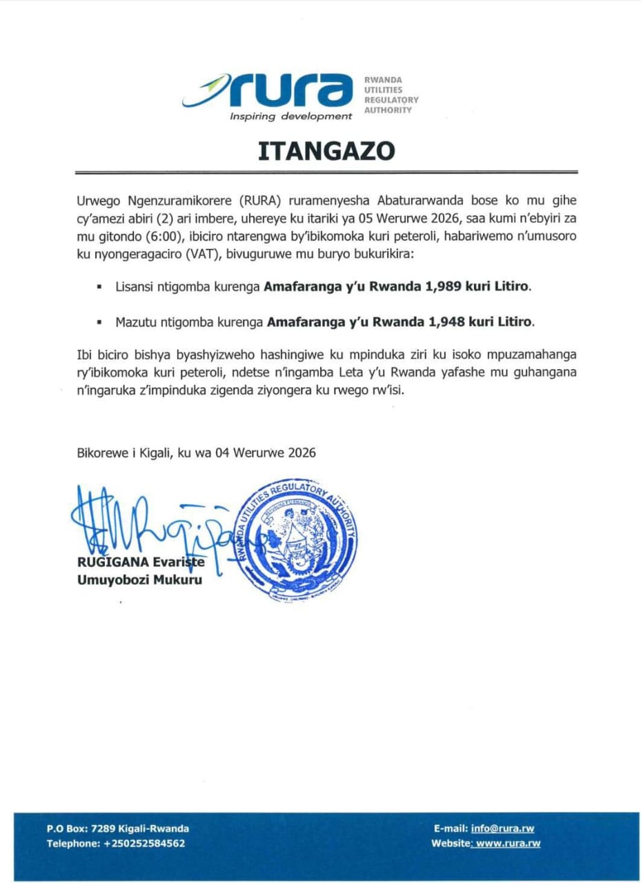 RURA yatangaje ko uhereye ku wa 5 Werurwe 2026, litiro ya lisansi itagomba kurenza 1989 Frw ari nacyo giciro cyari gisanzweho, naho iya mazutu itagomba kurenza 1948 Frw ivuye ku 1900 Frw.