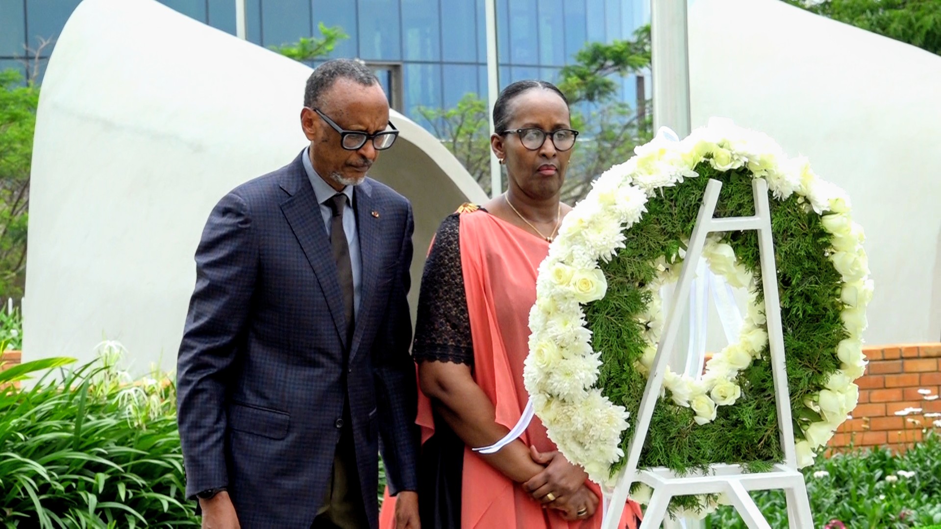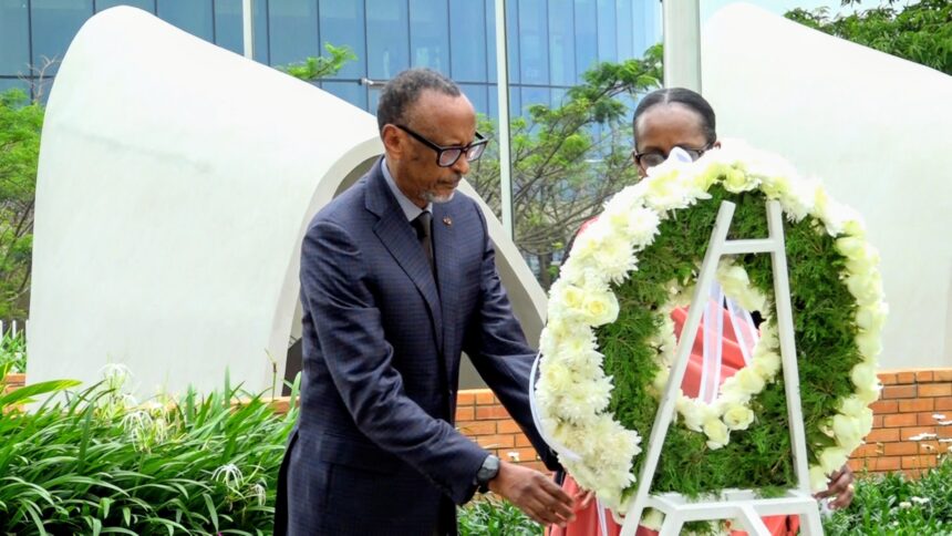 Perezida wa Repubulika Paul Kagame na Madamu Jeannette Kagame bunamiye intwari z’u Rwanda, banashyira indabo ku kimenyetso cy’ubutwari kiri ku gicumbi cy’intwari i Remera mu mujyi wa Kigali.